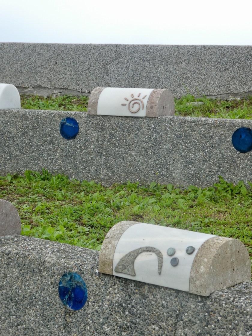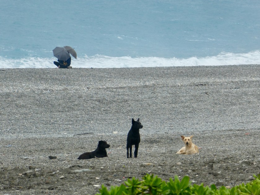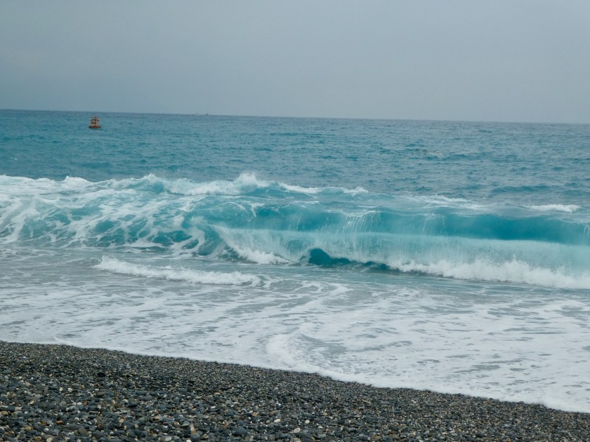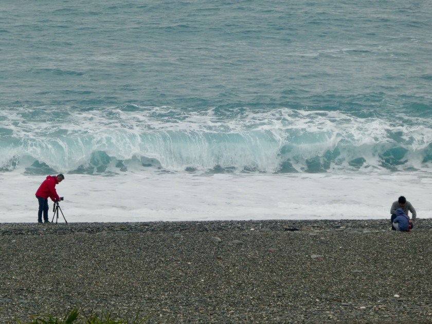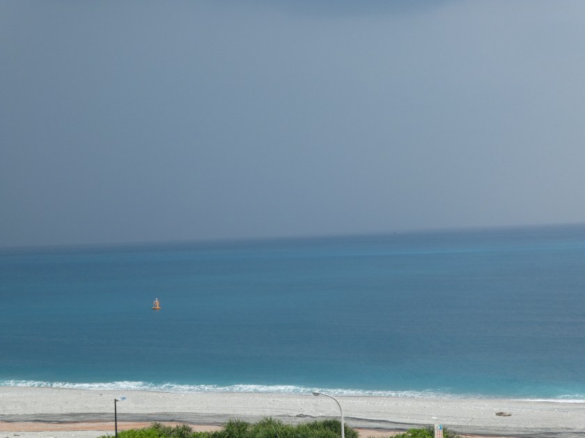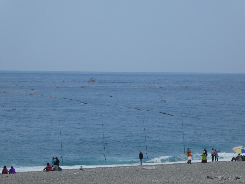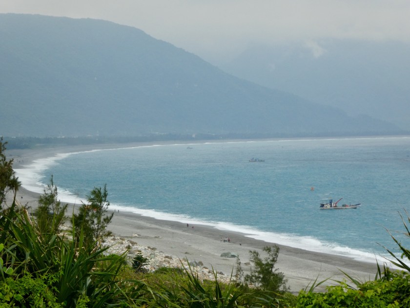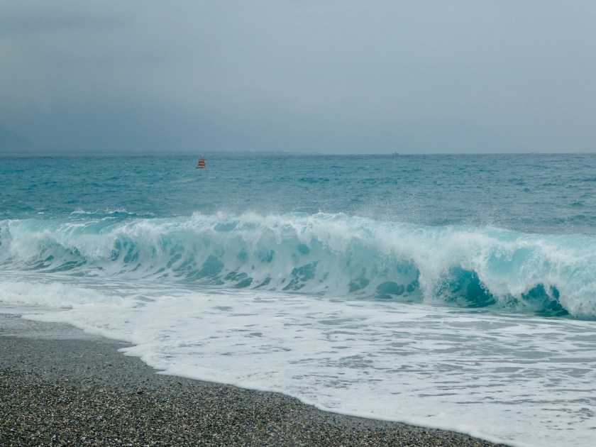 After a lovely three hour train ride south along Taiwan’s eastern coast, we arrived in Hualien, Taiwan. The countryside is mountainous, lush and green. We passed several huge factories, including a Crayola Crayon factory, with huge towers in crayon shapes of primary colors. We passed miles of flooded millet fields. They look very similar to rice paddies. Our Hotel Bayview driver was waiting for us at the train station and took us to our darling accommodation, 15 minutes outside of town, on a gorgeous, pebbly stretch of Qixingtan beach. The hotel upgraded us to a beachfront room. It’s the sweetest little boutique hotel, right on the water. They provide complimentary shuttle service, bicycles, a nice buffet breakfast, beverages and snacks 24/7… at $66 per night…unbelievable! Our hotel is adjacent to an Air Force base, and we’ve enjoyed watching fighter-jets take off and land…such a powerful show of force. We walked on the beach as far as we could in each direction and collected colorful smooth stones. We watched bulldozers pull heavy nets from fishing boats. We enjoyed roasted yams from a roadside truck, and sausage on a stick from another stand. The ocean is gorgeous and the waves are really strong. When the water recedes, you can hear the rocks clicking as they drop back down on the shoreline.