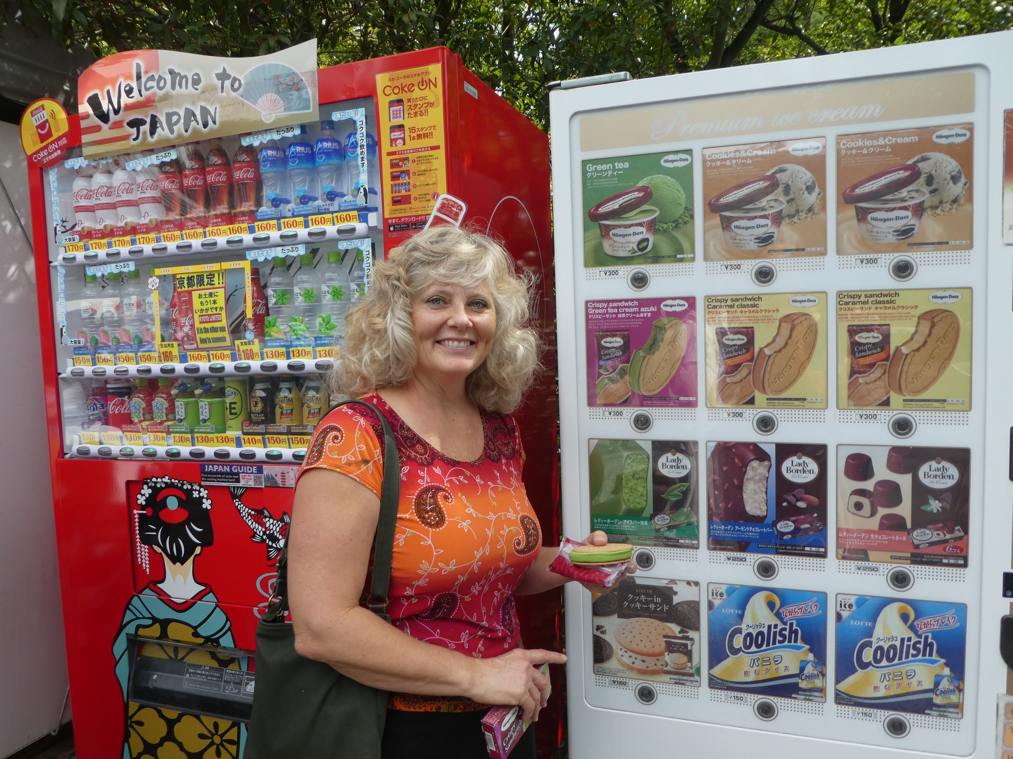 In Kyoto, we went to a famous Buddhist “zen” temple, the Golden Pavilion. It has been mused to host nobility and foreign dignitaries. The top two floors of the temple are covered in gold-leaf. It is surrounded by coy-fish ponds and lovely gardens, with a separate tea-house and temple. We had green tea with gold leaf and green tea flavored ice cream there. There is plenty of good coffee around. Starbucks is quite popular, but green tea (matcha) is more common. We tried a matcha scone with our coffee at Starbucks. There are the usual big chains here. It’s interesting to see how they differ. Burger King offers whoppers with shrimp, and Mc Donald’s has cream cheese & crab pies. Everything is packaged very prettily. Bruce bought a yogurt drink that the checker put into a small bag with a tiny ice pack!(about 2×3”)😍 When you eat at a restaurant, the server brings a wicker basket for your backpack, purse, and/or parcels. We didn’t see much dirt in Japan, but they wouldn’t chance soiling your bags.