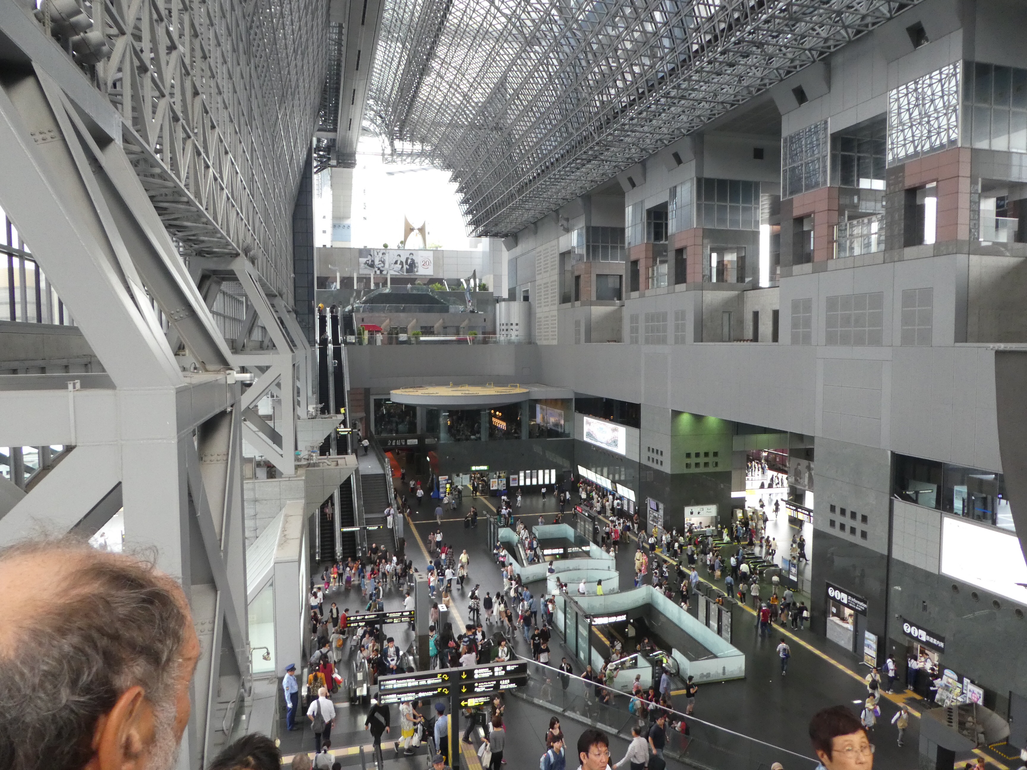 We made it to three cities over six days, Osaka, Kyoto, and Kobe. In Osaka, we enjoyed a free walking tour. The Dotonburi and Kunomon areas are packed with food shoppers and restaurants. Buildings feature enlarged plastic sculptures of gyoza (Japanese dumplings),crabs 🦀 with moving legs, and octopus 🐙 advertising their food specialties. We tried the Takoyaki, octopus-filled dumplings, but decided we like Mexican “tacos” much better! We also tried Japanese curry, which was delicious, though surprisingly spicy, and teppanyaki, food grilled at your table and eaten off the grill. We chickened out on the turtle clay pot and sharks fin soup. There are Biliken sculptures (a God of good luck), whose feet you rub for good luck. We ate yummy sushi and enjoyed tempura and noodle dishes everywhere. We ate very little fruit because it was very pricey. Linda had a treat of twelve large green grapes for $3.00, and one day we ate four bananas for $6, but we saw cantaloupe for around $18, and peaches, five per box, for nearly $30! The streets light up in colorful neon lights at night. There was a section dedicated to “Anime,” a very popular Asian cartoon style, and one area famous for “maid cafes,” where servers dress like maids. It’s a popular but a strange concept with odd sexual overtones. Young women try to look like little girls in maid costumes. “K-Pop” (a music genre) has a “bubble-gum”sound and adult performers dress like little girls. We saw one group perform at the Kyoto train station and found it distasteful. The train stations are huge. They can be several stories high.