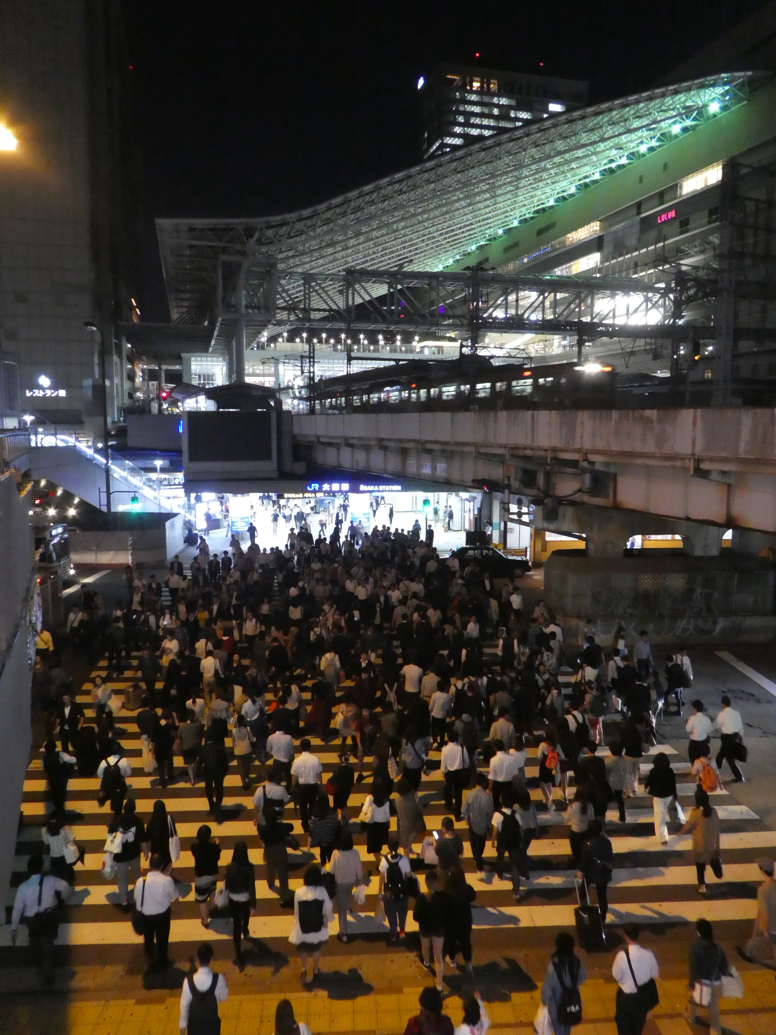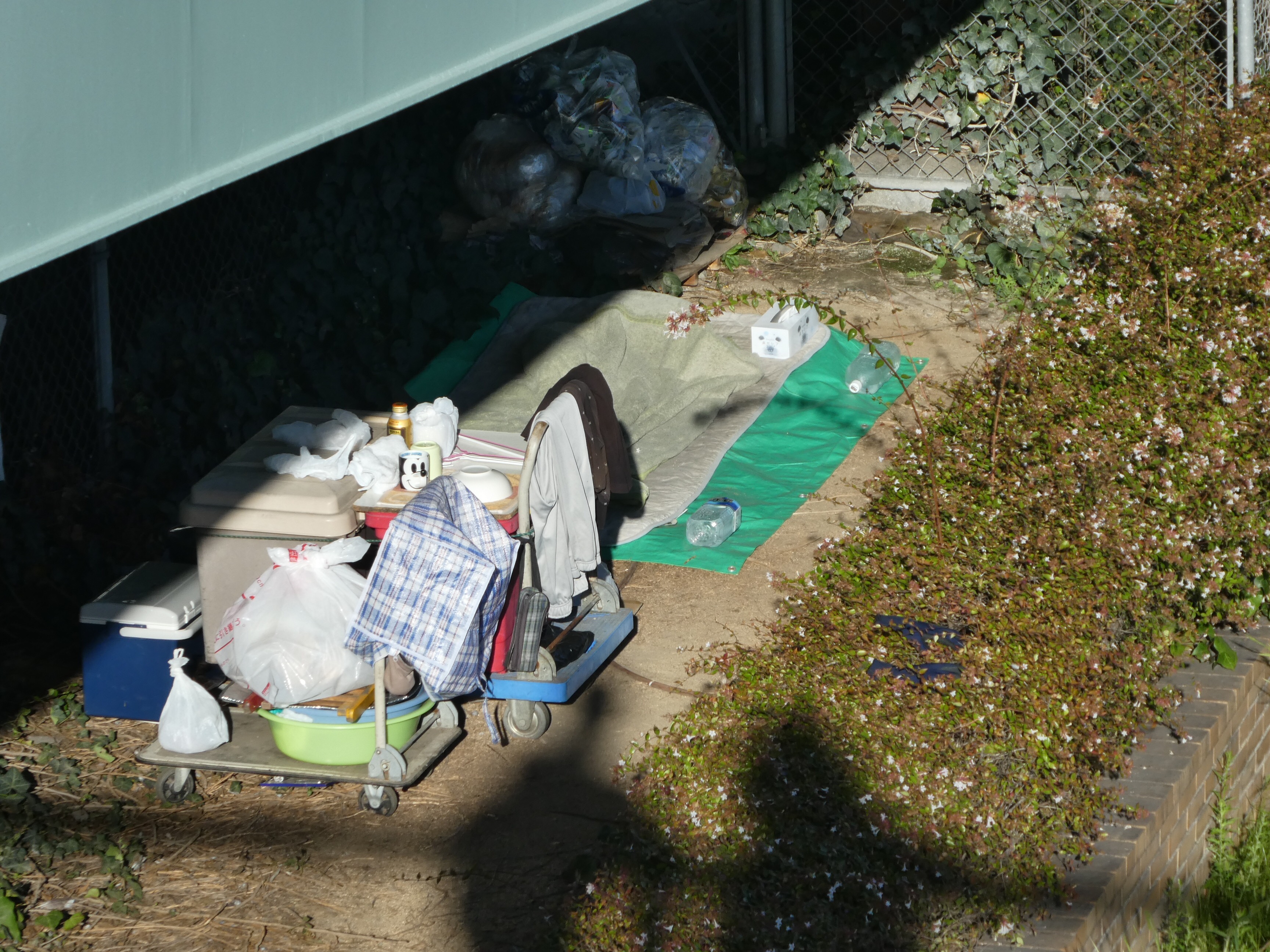 We arrived just after 12 midnight at Toyoko Inn 2, Nakatsu/Umeda in Osaka, Japan. Our friend, Minoru, helped find and book this wonderful hotel chain in the heart of Osaka. We thought it would be so hard to find, especially late at night, but kind Japanese people guided us on our way. Japan is such a breath of fresh air! It is so clean, orderly, and pretty, and feels loving and safe, just the way you wish the whole world would be. A group of teenagers joyfully escorted us to the right subway train, and we took a group photo. 😎 Many people speak or understand a little English. Though shy, they are happy to try to communicate with us, once we reach out to them. People often smile and bow respectfully to us, and to each other. Osaka is teaming with nearly three million people, tall buildings, great infrastructure, and busy traffic. Most people are well dressed, well employed and well mannered. We have not seen even one homeless person begging on our trip so far in either Vietnam or Japan. Yesterday, we saw evidence they must exist. There was a tidy “camp” under a walking bridge.